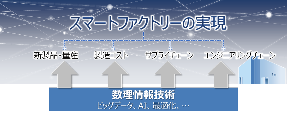 ものづくりのエンジニアリングチェーンやサプライチェーンにおける人手依存の不確実性の抜本的解決のため、短期および中長期の視点から、IMIのシーズ発掘や産業ニーズとのマッチングの経験、およびビッグデータ・AI・最適化などの数理情報技術の活用を通して、全学術分野を横断した学際的研究を推進します。特に九大OIP株式会社を含む三者共同で独自の仕組み「スモールスタート・ステップアップモデル」を考案・導入し、「シーズ発掘→マッチング→共同研究」のプロセスを効率的に行うことで、多様な学術分野との連携による研究をスピーディーに推進します。
