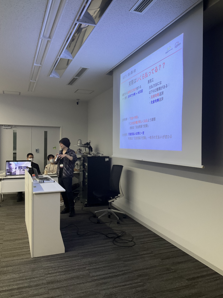 松江要教授の講義ではまず、複利計算の実例を通して数列との関連性が示されました。続いて、「未来の価値を現在の価値に換算する」という発想が紹介され、貯蓄に限らず、支払いや負債といった状況にも同様の考え方が適用できることが説明されました。さらに、複利計算のスパンが短い株式の例を通じて、微分・積分との関係にも触れ、先端的な数理の一端を学ぶ機会となりました。