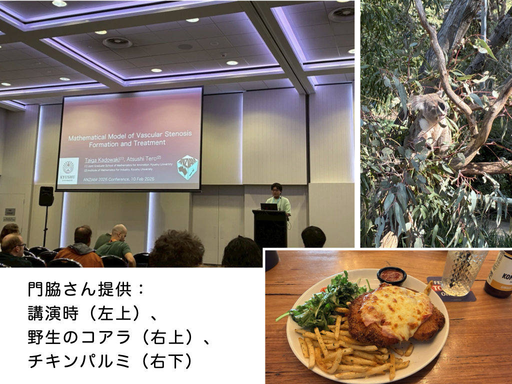 オーストラリアのキャンベラで開催されたANZIAMに参加しました.私にとっては今回が初めての海外での口頭発表ということもあり,現地に向かうまでは期待と不安が入り混じっていました.キャンベラは自然豊かな美しい都市で,食事も非常に美味しかったです.講演では,血管内のプラーク形成と治療を粒子のランダムウォークを用いて効率的に計算するモデルについて発表しました.発表直前は緊張感がありましたが,会場の雰囲気は非常に温かく,落ち着いて発表を終えることができました.印象的だったのは,セッションの合間に設けられるティータイムの文化です.紅茶や軽食を片手に,様々な地域の学生や先生方とフランクに研究や日常について話すことができ,研究に対するモチベーションが大きく向上しました.この学会で得た経験と繋がりを,今後の研究活動に活かしていきたいと思います.
