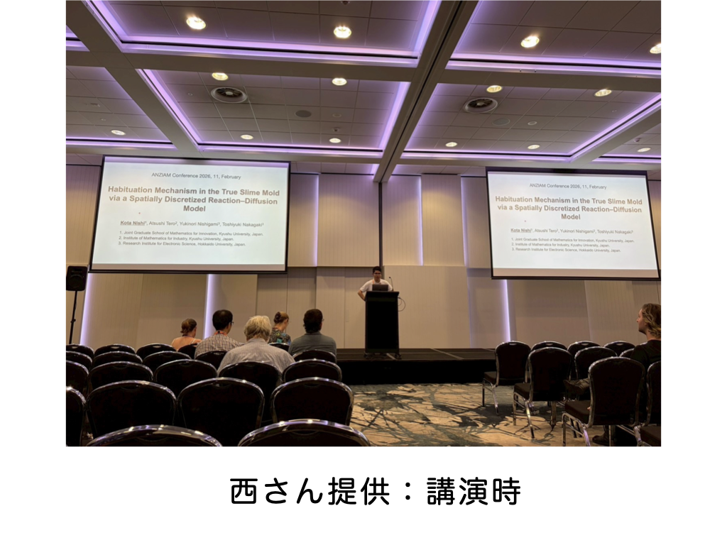 2⽉8⽇~12⽇にかけて、オーストラリアのキャンベラで開催されたANZIAMに参加してきました。オーストラリアは夏の時期で、滞在中には暑い⽇もありましたが、⽐較的涼しく過ごしやすい⽇が多かった印象です。私は、真正粘菌の馴れの学習メカニズムの数理モデリングについて⼝頭発表を⾏いました。発表を通して、⾃⾝の研究内容を英語で分かりやすく伝えることの難しさを実感し、英語⼒の向上が必要であると痛感しました。その⼀⽅で、拙い英語にも関わらず、理解しようと⽿を傾けてくださるオーストラリアの⼈たちの温かさも感じました。本学会での経験を通して得た学びを、今後の研究の発展につなげていきたいと思います。
